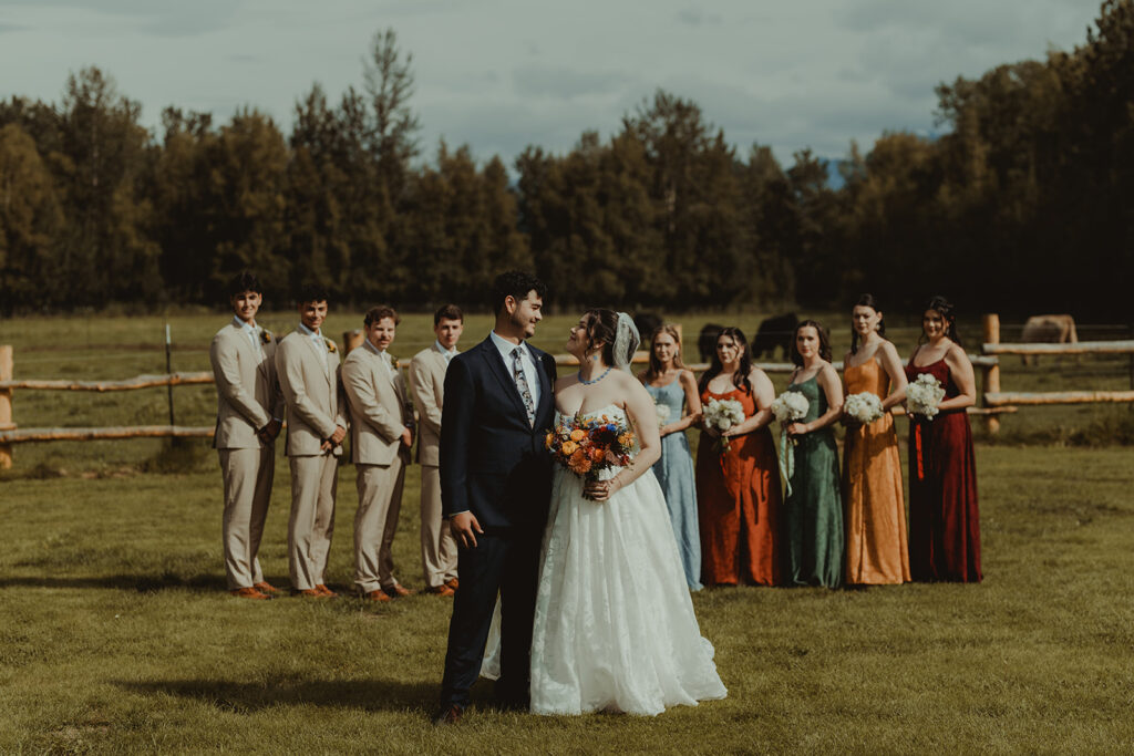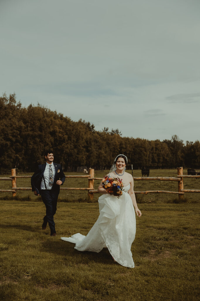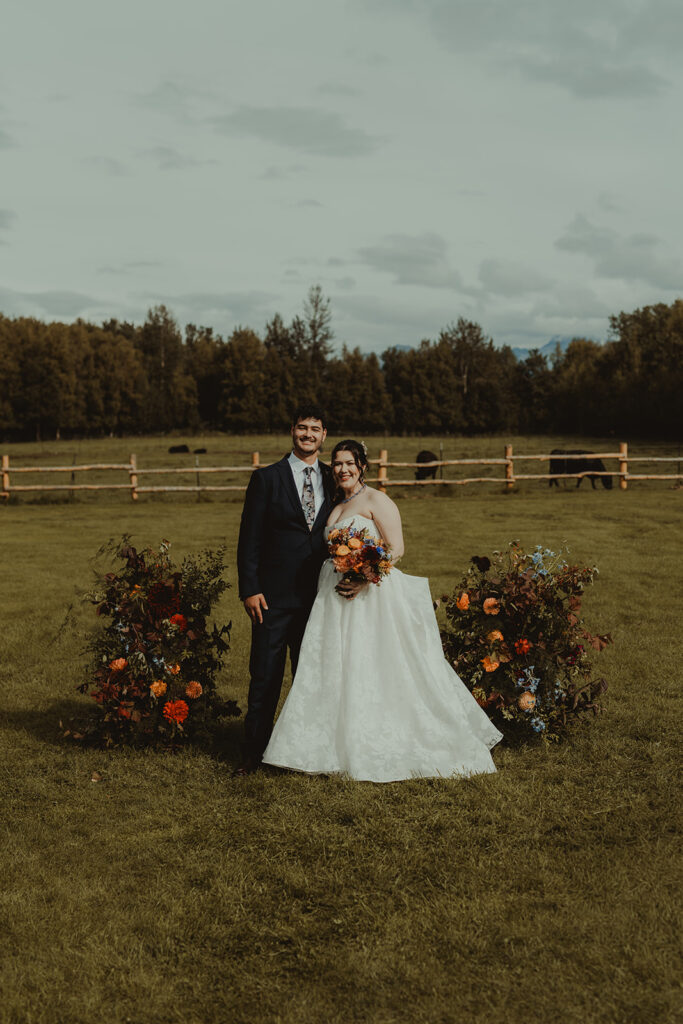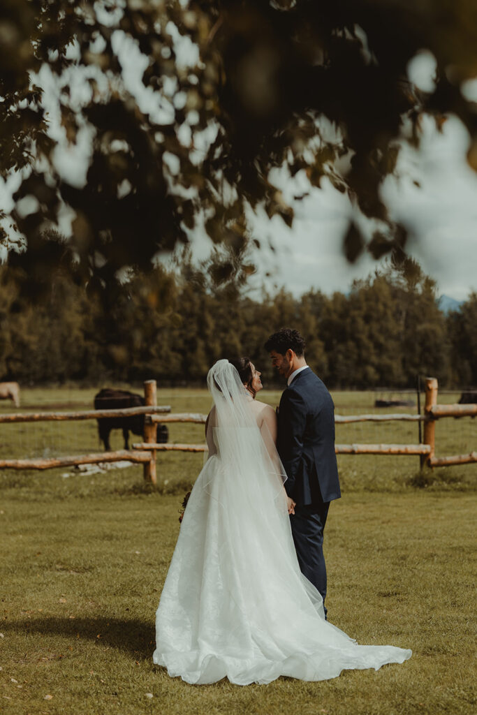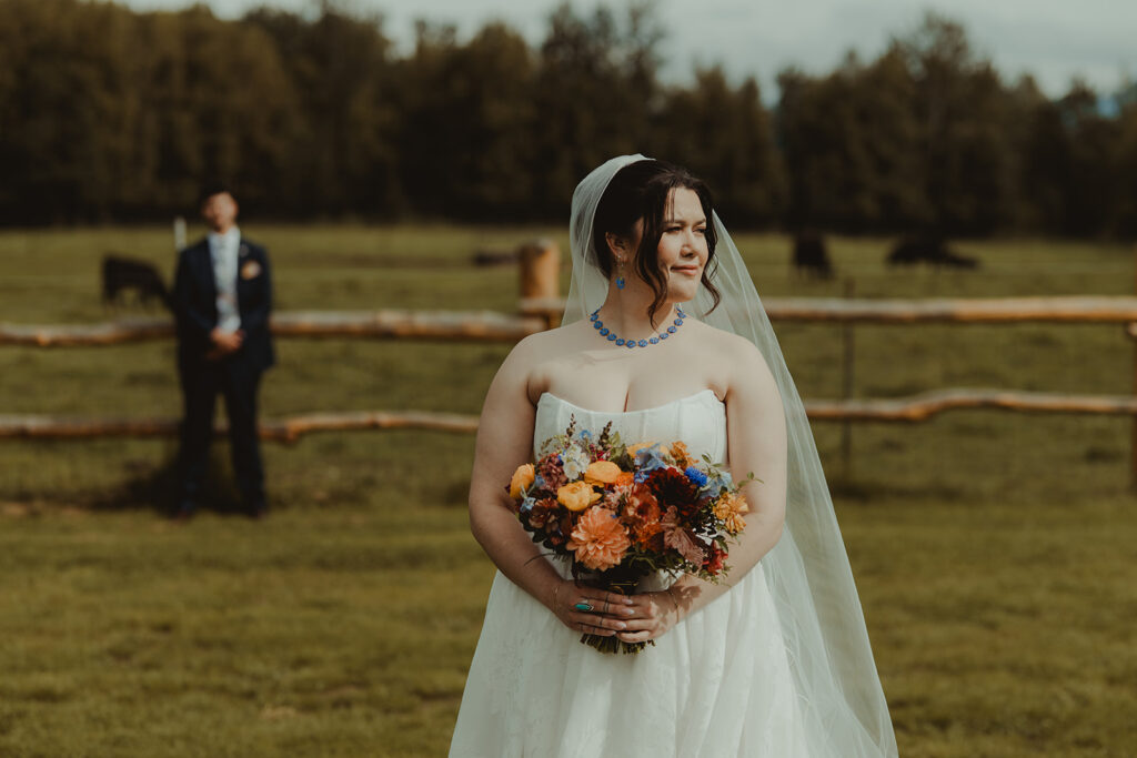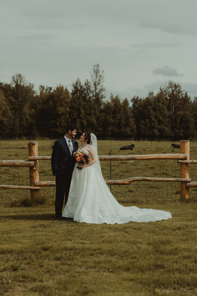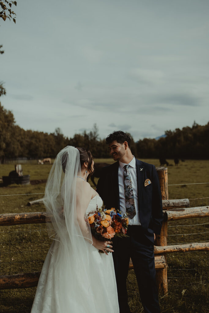 Because there was this dance of elegance, eclectic, and fun vibes all around, my photography style was to get all of the must-have shots in a professional way, but then also lean into the request for capturing the silly moments and to use a creative take to staging and editing when possible. We used Teigan’s long veil for some sleek peaky photos and I kept to my go-to moody vibes for a portion of the edits. This worked perfectly with the Barn venue and allowed the neutrals to mellow out while the colors popped. As an Alaska wedding photographer, it’s always special to capture such warm, natural, and vintage-inspired moments for the bride and groom. The entire venue, day, and crowd all radiated a very warm and natural tone, leaving us with a vintage feel in most of the photography.