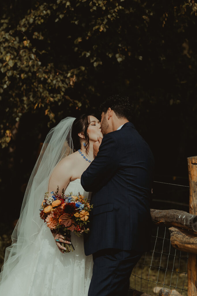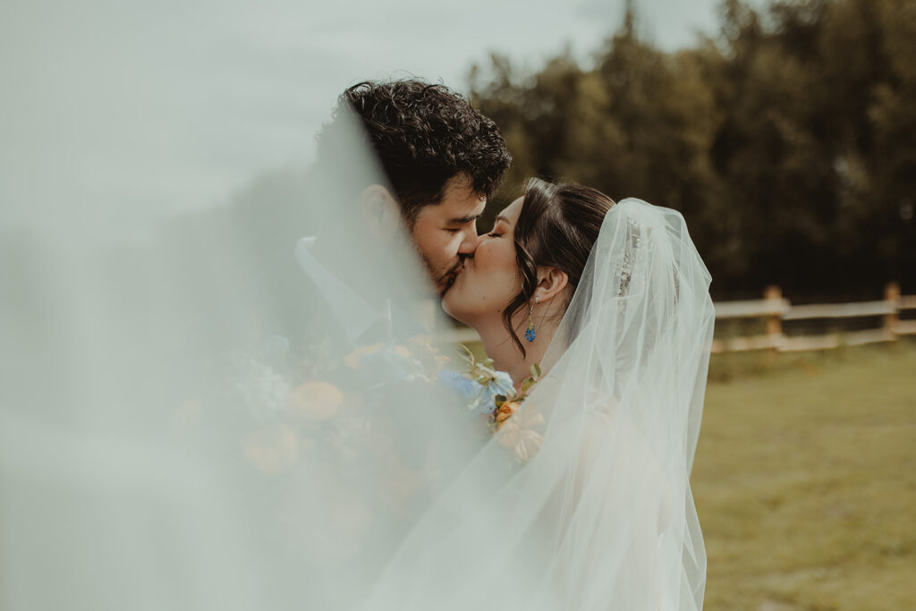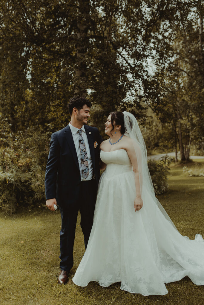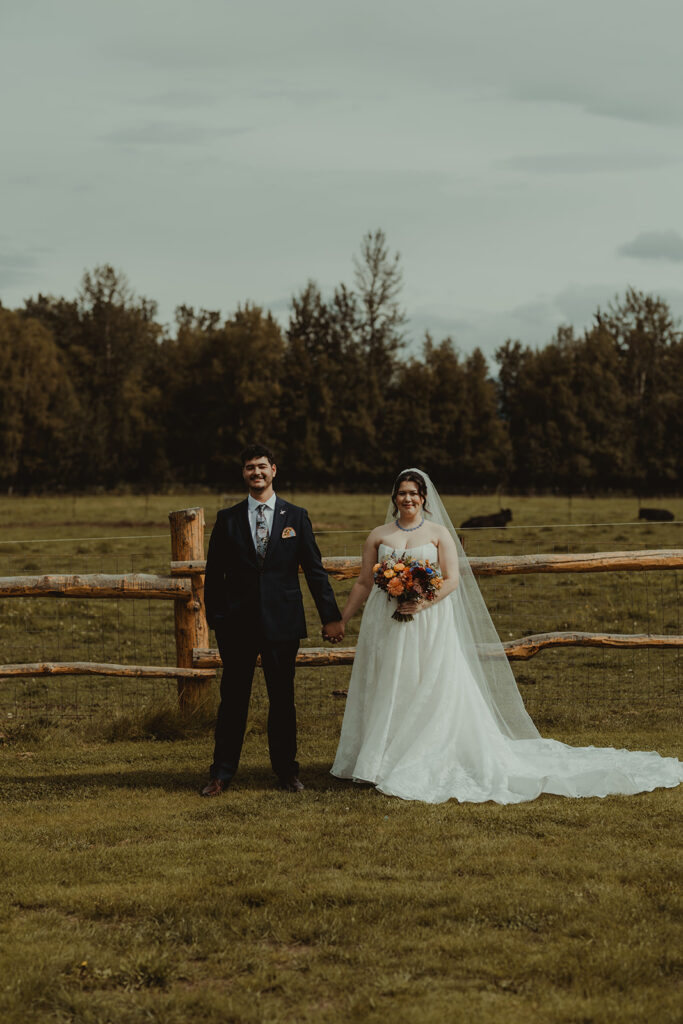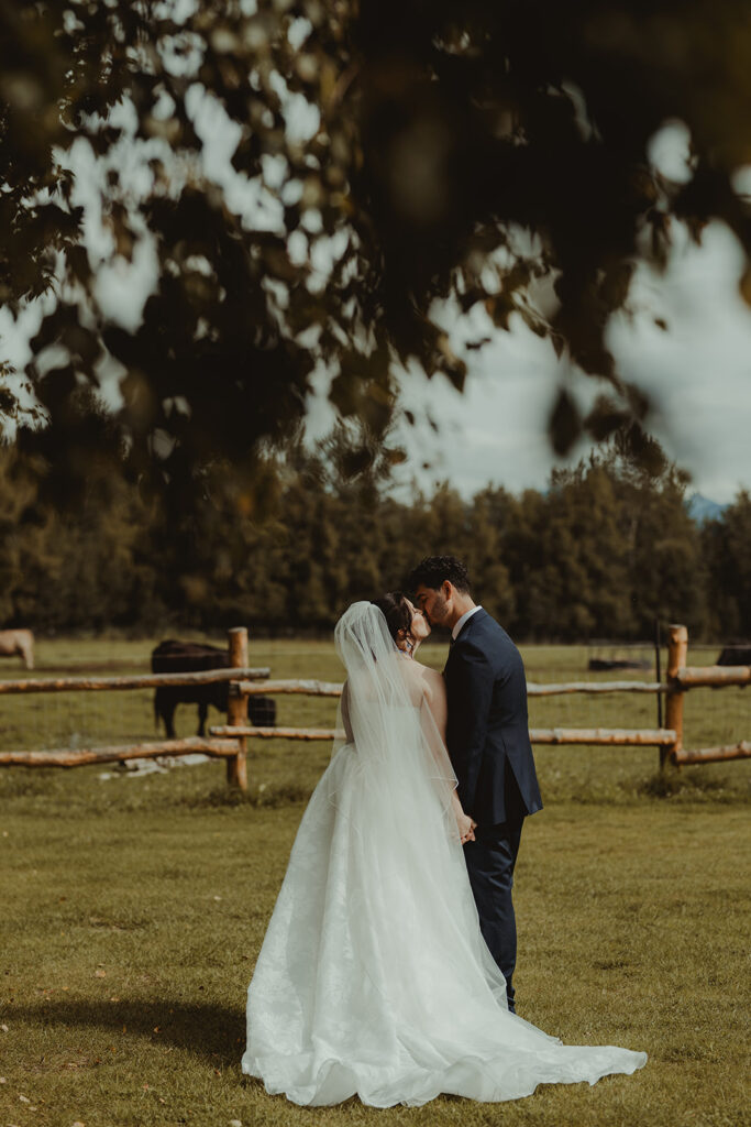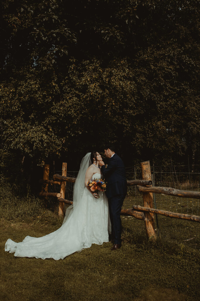 Because there was this dance of elegance, eclectic, and fun vibes all around, my photography style was to get all of the must-have shots in a professional way, but then also lean into the request for capturing the silly moments and to use a creative take to staging and editing when possible. We used Teigan’s long veil for some sleek peaky photos and I kept to my go-to moody vibes for a portion of the edits. This worked perfectly with the Barn venue and allowed the neutrals to mellow out while the colors popped. As an Alaska wedding photographer, it’s always special to capture such warm, natural, and vintage-inspired moments for the bride and groom. The entire venue, day, and crowd all radiated a very warm and natural tone, leaving us with a vintage feel in most of the photography.