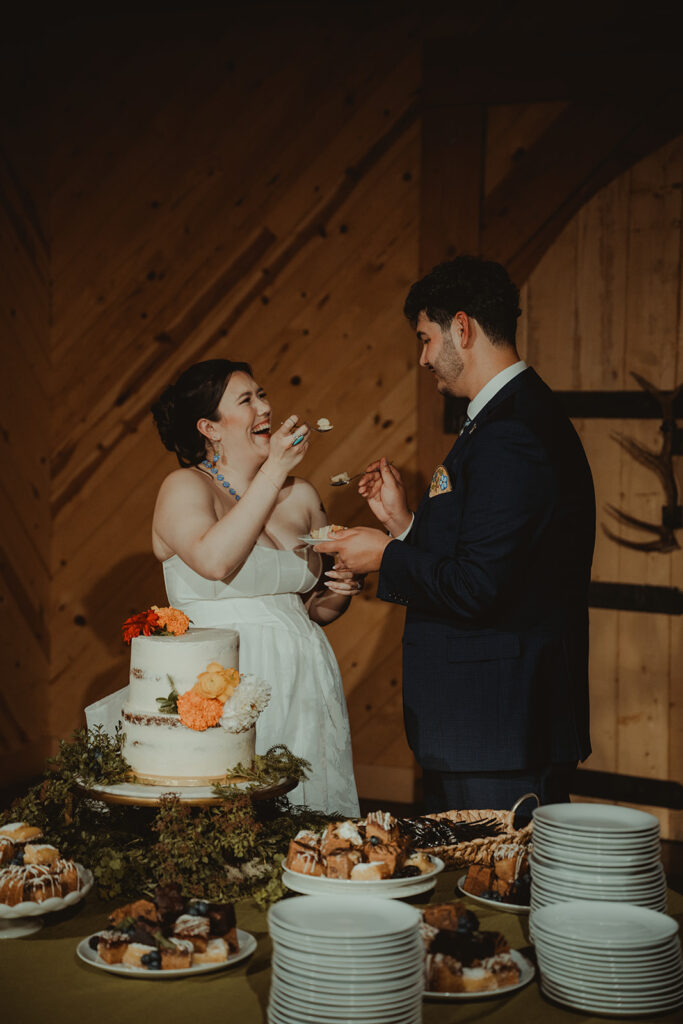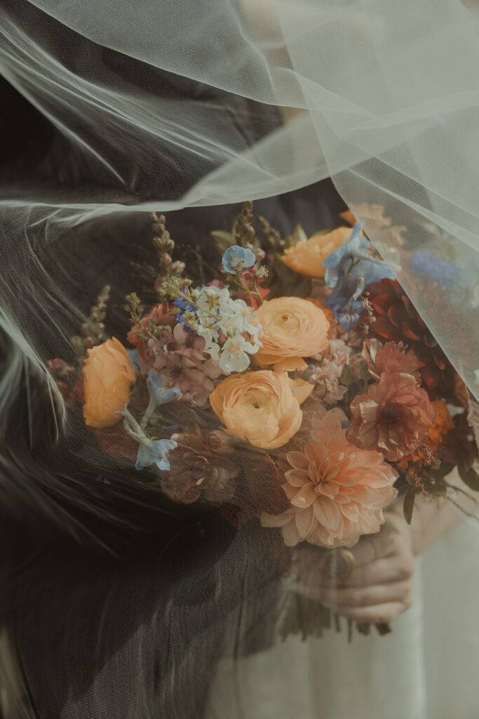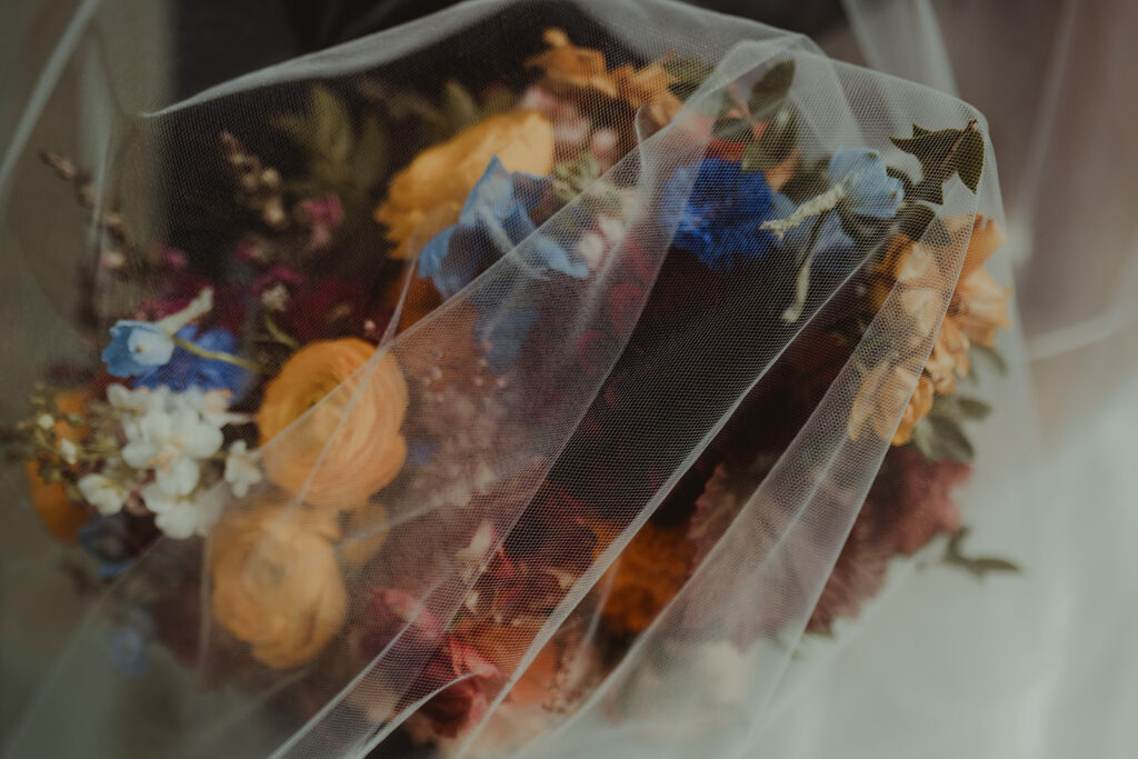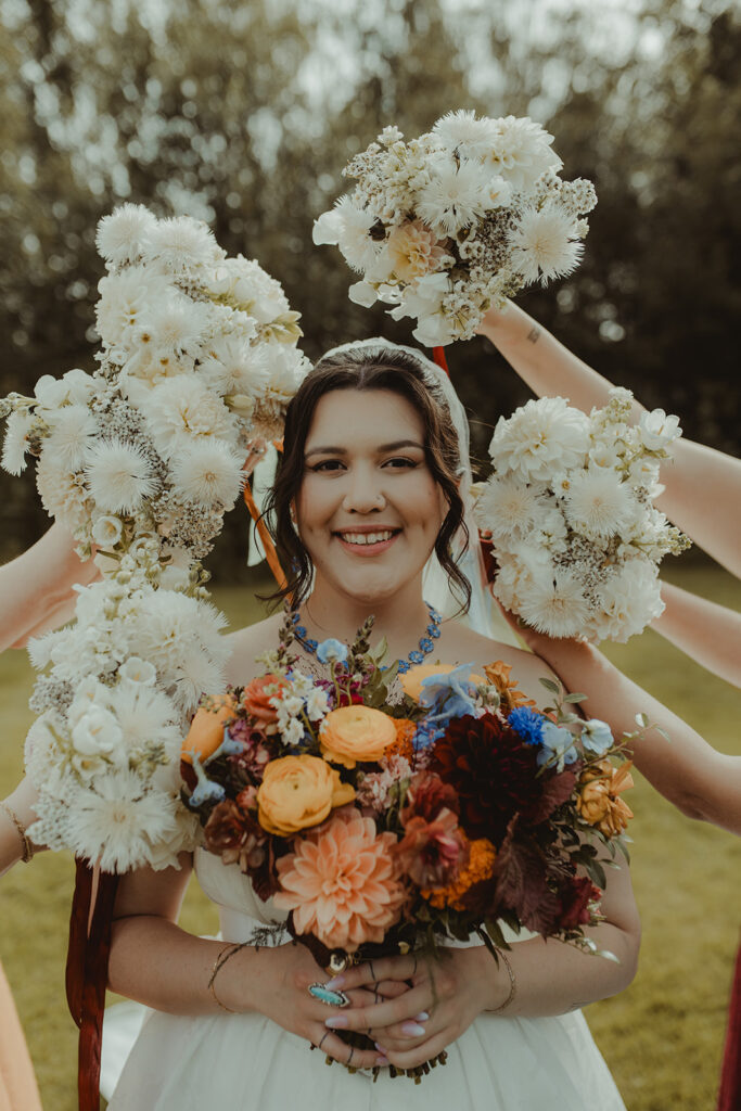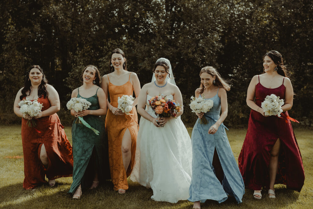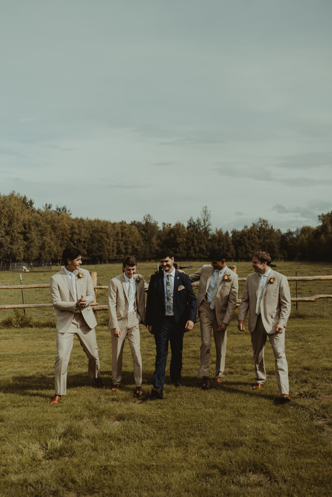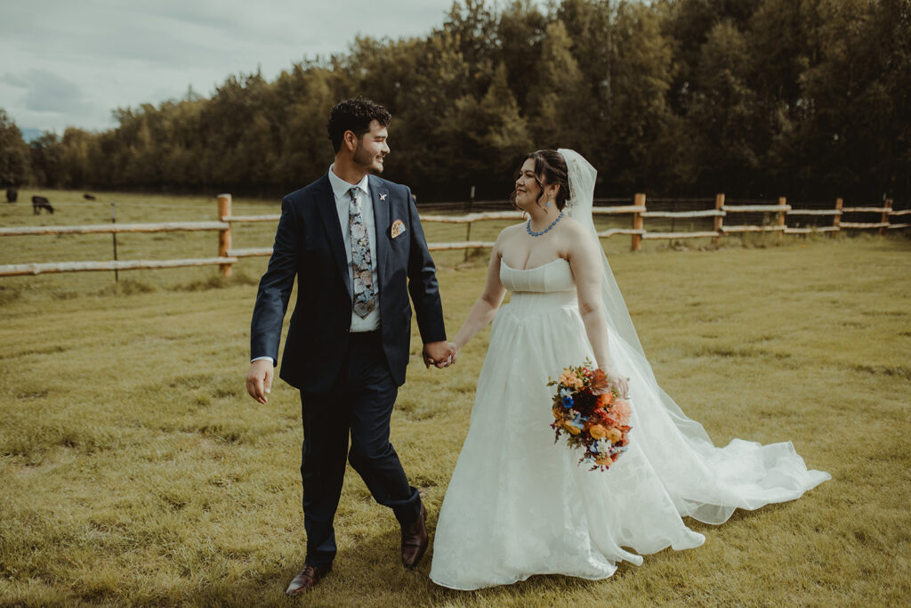 Because there was this dance of elegance, eclectic, and fun vibes all around, my photography style was to get all of the must-have shots in a professional way, but then also lean into the request for capturing the silly moments and to use a creative take to staging and editing when possible. We used Teigan’s long veil for some sleek peaky photos and I kept to my go-to moody vibes for a portion of the edits. This worked perfectly with the Barn venue and allowed the neutrals to mellow out while the colors popped. As an Alaska wedding photographer, it’s always special to capture such warm, natural, and vintage-inspired moments for the bride and groom. The entire venue, day, and crowd all radiated a very warm and natural tone, leaving us with a vintage feel in most of the photography.
