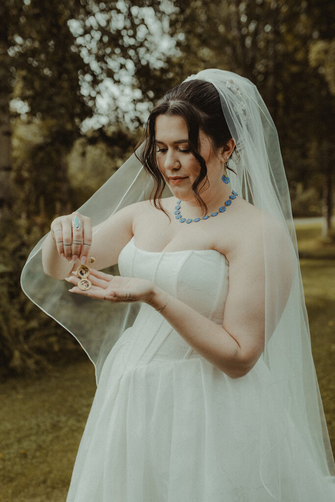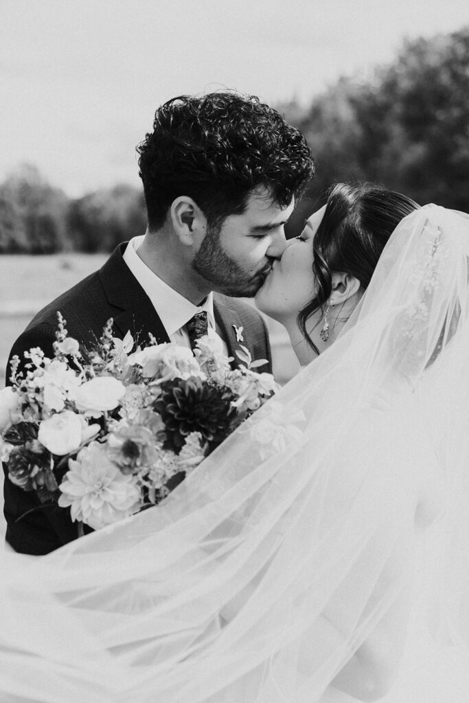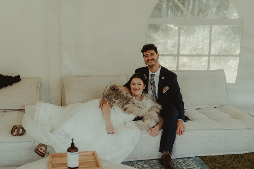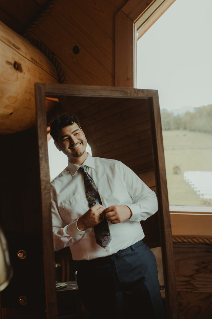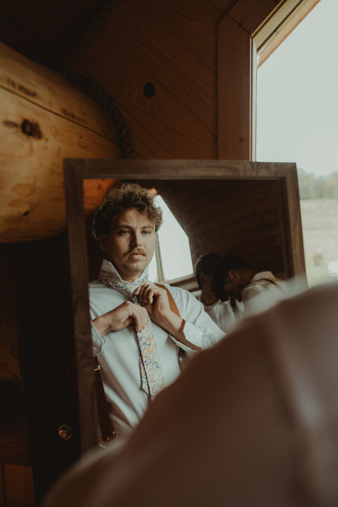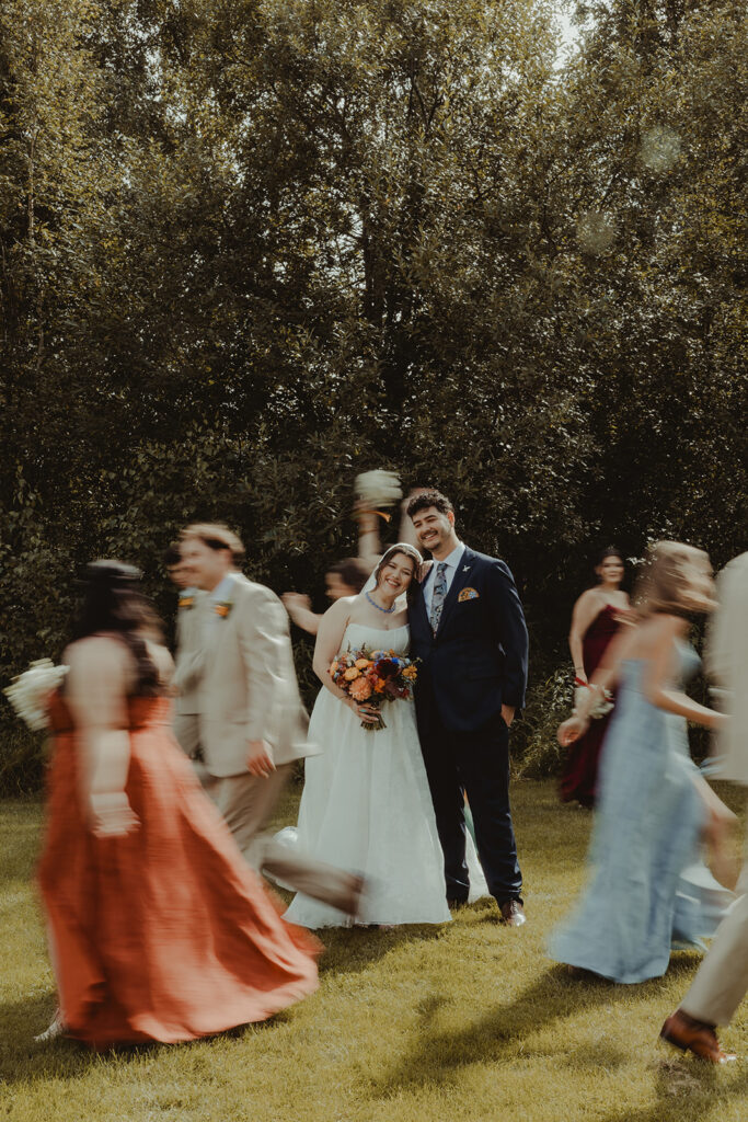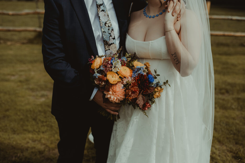 Because there was this dance of elegance, eclectic, and fun vibes all around, my photography style was to get all of the must-have shots in a professional way, but then also lean into the request for capturing the silly moments and to use a creative take to staging and editing when possible. We used Teigan’s long veil for some sleek peaky photos and I kept to my go-to moody vibes for a portion of the edits. This worked perfectly with the Barn venue and allowed the neutrals to mellow out while the colors popped. As an Alaska wedding photographer, it’s always special to capture such warm, natural, and vintage-inspired moments for the bride and groom. The entire venue, day, and crowd all radiated a very warm and natural tone, leaving us with a vintage feel in most of the photography.