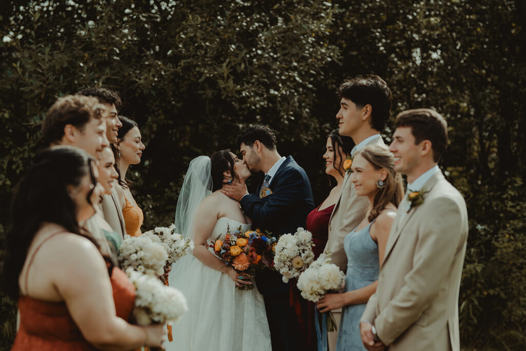 After the first look we gathered family and then the bridal party together for more photos, and in contrast to the groomsmen’s synchronized in tan suits, the bridesmaids wore mis-matched colored dresses, one for each of the chromatic themes seen throughout the event – timeless blue, neutral oranges, coral and floral green. All making the flower choices and decor pop!