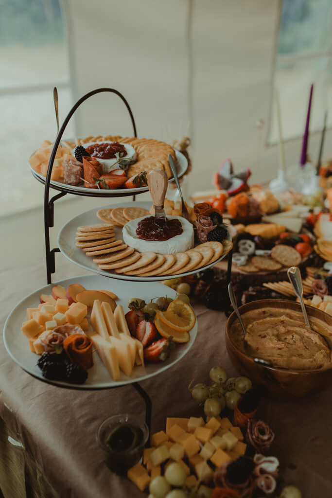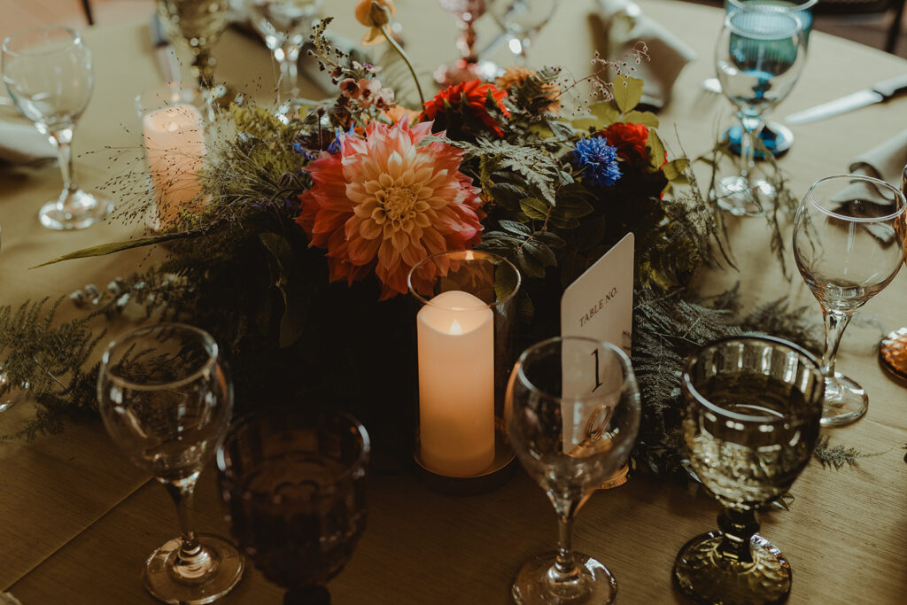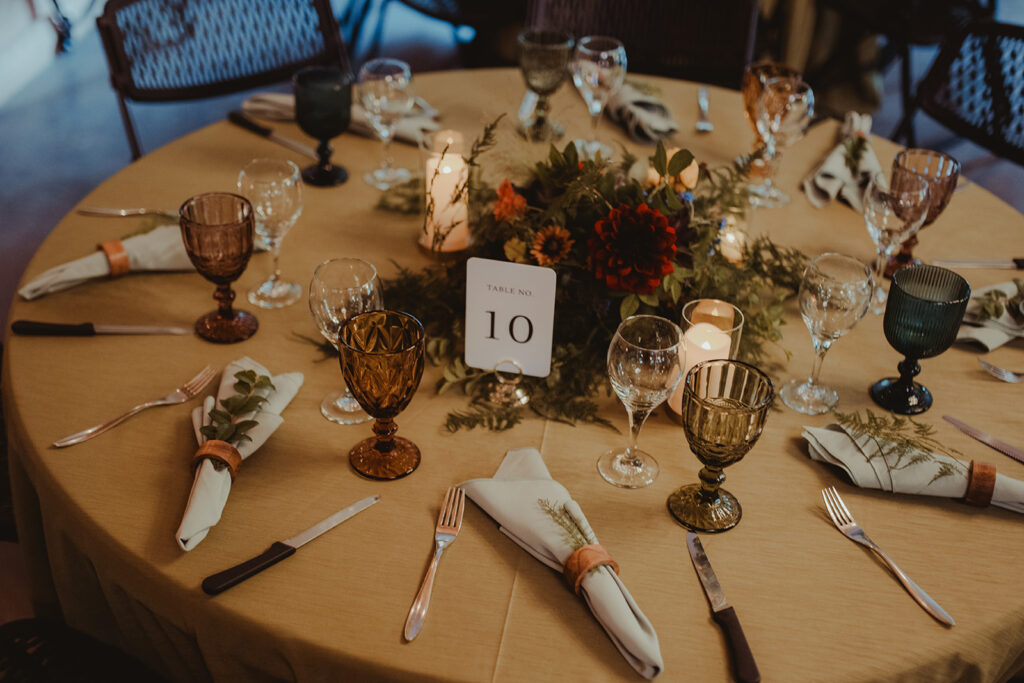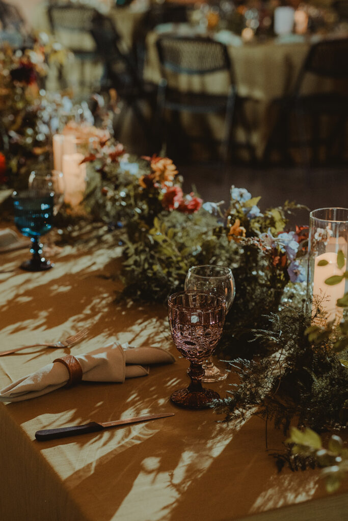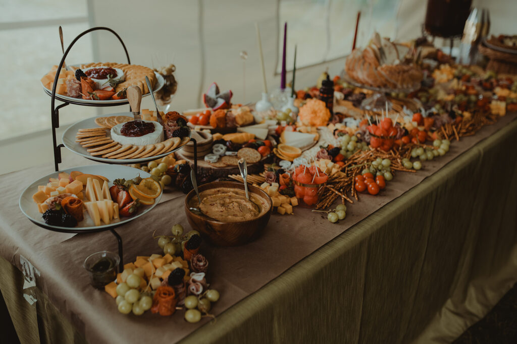 Like the bridesmaids dresses, the table and center pieces wowed the crowd, decorated with a classic eclectic mis-matching style with vintage crystal goblets, neutral table decorations, and leather bound napkin rings for enjoying the extravagant charcuterie snack table.