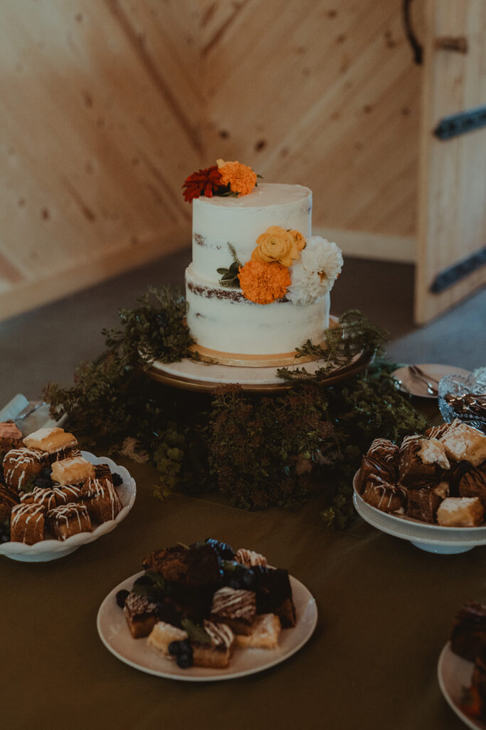 A simple, nearly naked dainty cake with a plate of brownies and sweet bites made cake cutting an easy occasion for the couple. Serving guests was a breeze.