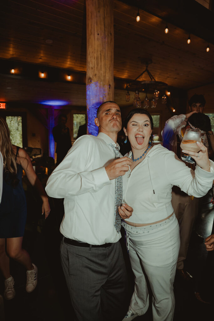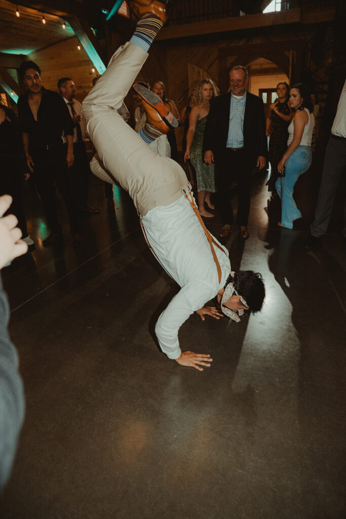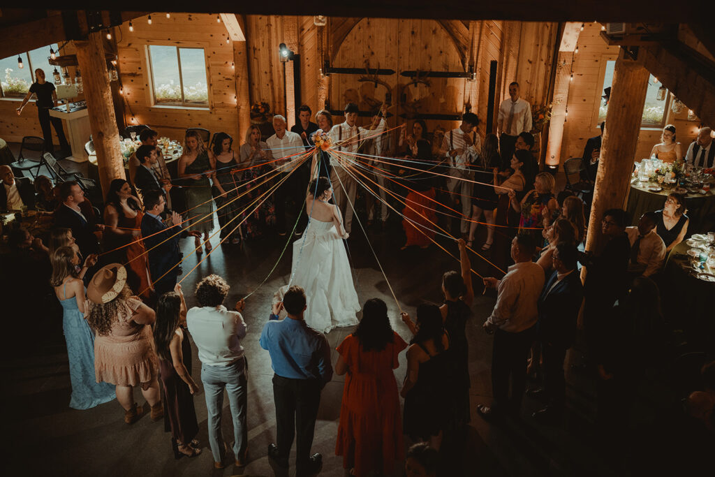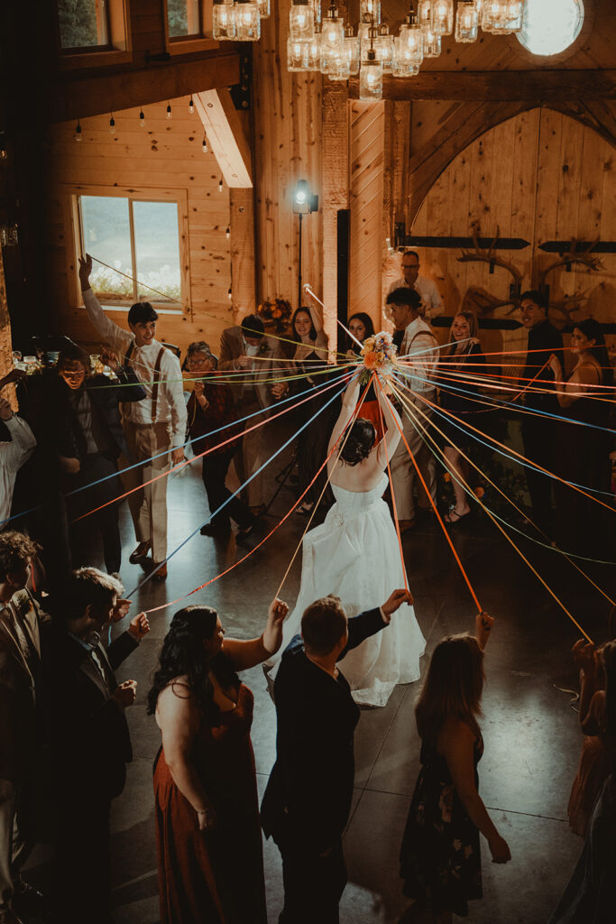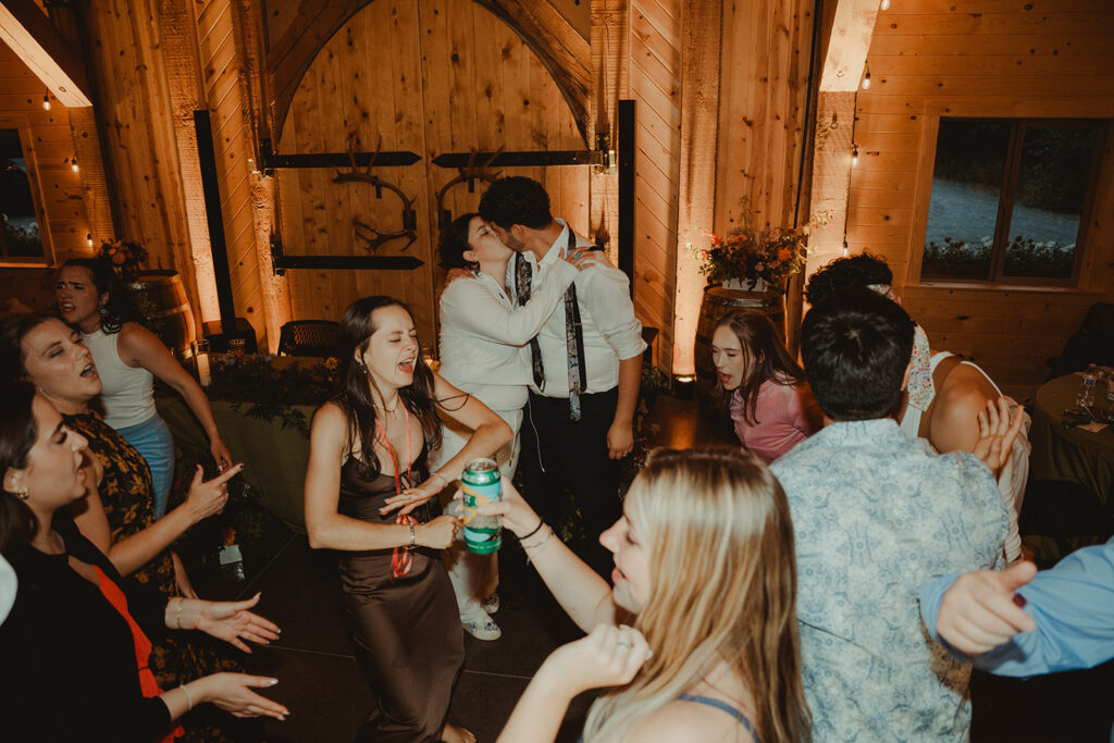 The day outside was wrapped up as the barn transformed throughout the evening to a party space. Speeches and dancing ensued for the rest of the endless Alaskan night. Where Teigan and Glenn had the most elaborate floral decorated bridal table at the head of the room backed with antler laden barn doors for some of the best candid photos of the couple that evening. After cake and a maypole dance, there was an outfit change to casual velvet sweat-suits. The party amped up with everyone’s best 90’s dance moves and shotgunning seltzer for a truly memorable (or not) reception party. This put a period on this big, beautiful, and perfectly dreamy Alaskan wedding.